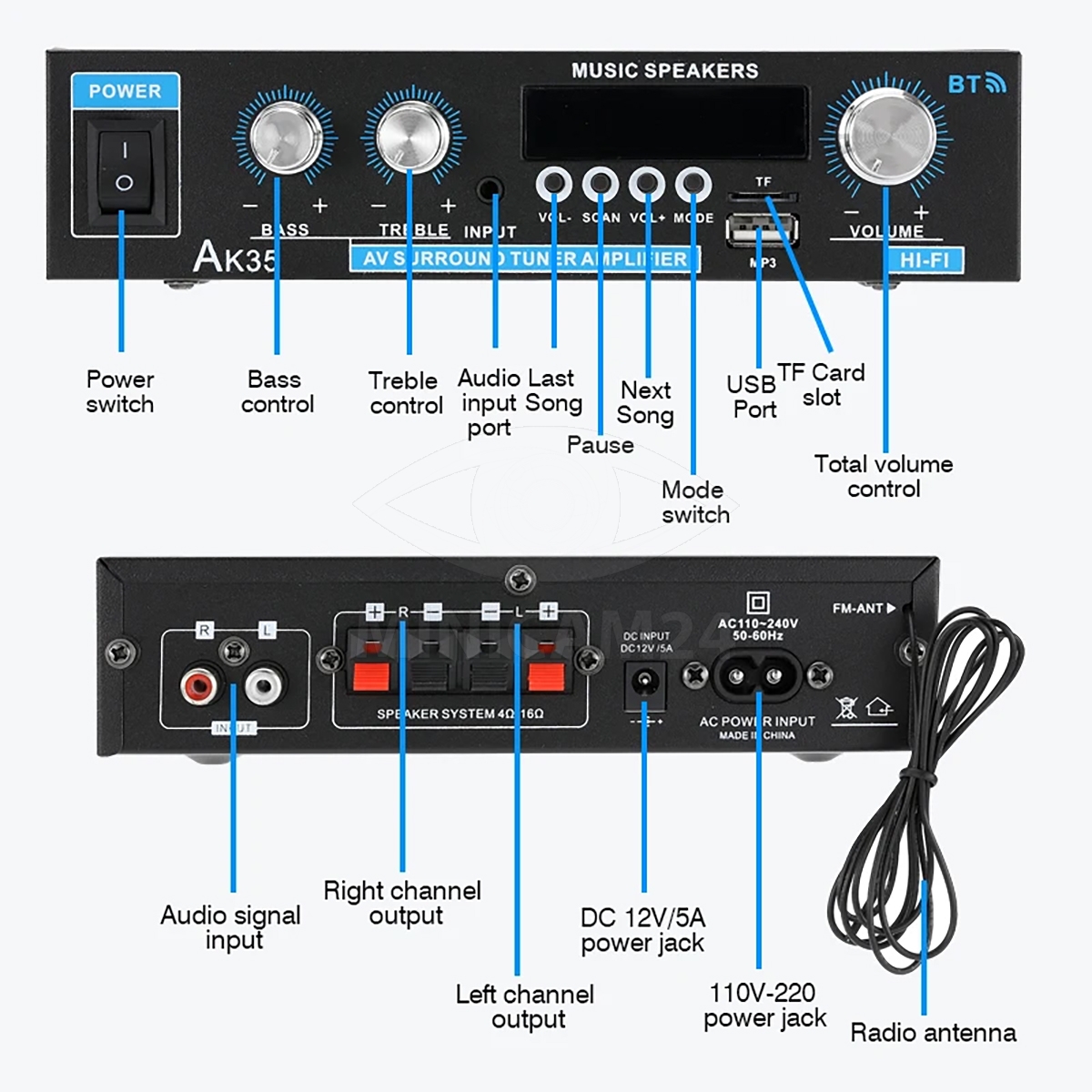 В комплект входят усилитель мощности, пульт дистанционного управления для удобства, адаптер и инструкция, что делает настройку и использование устройства простым и интуитивно понятным. Starklok AK35 — идеальный выбор для домашних аудиосистем и небольших мероприятий.